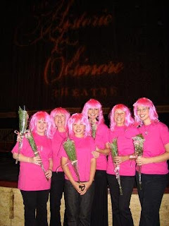 Stacey gave us all hugs, admired the pink wigs and then went inside to go warm up as we walked around the block to the stage door. Downstairs in the dressing rooms, underneath the stage, we put on the last touches to our makeup. In the halls, we got to talk to the other performers, some we knew, some we didn’t. I then grabbed my coat to cover my costume including the hair and crept upstairs to find out where Stacey was sitting. She’s never to hard to spot with her curly ringlets. Ah! 3rd row, she would to the left of our view when we were on stage. (Not that you can see anything but lights swimming in the blackness.) I went downstairs to tell the rest of the troupe, and then at different times, we slid up to the stage wings to watch the other performers until it was our turn to go on. The Latte Boy was particularly funny and the woman who sang the first half was a kind person. It is really fun to see the “show” and then the SHOW, the show most people don’t get to see. That show takes place in the wings and I find it absolutely fascinating. For example, that song? It ended in heartbreak with Cinda lying on the floor. What the audience didn’t see was Cinda getting up immediately after the curtain went down and running to her friend who had sang it with her for a hug. That was priceless? And us? Well, we quietly walked to our places so when the curtain came back up, we were ready to go. The dance went really well, we smiled and had fun! (That was my Stacey version of a pep talk given on our way to the theatre.) After Stacey left, we rechoreographed the dance together, moving out of an inward facing circle to the audience and then to a chorus line at the end. We hadn’t told Stacey and she loved it just as we thought she would. It also really added to the performance. I can only imagine what she thought of her tappers as she saw us go into new formations, it’s something she had wanted us to do in different pieces for quite some time.